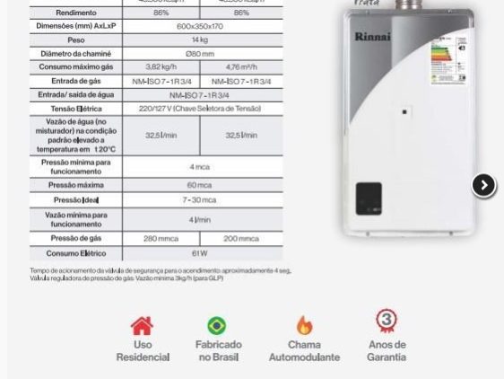 | Pontos de consumo | 4 ducha – 8L/min ou 3 ducha – 10L/min ou 2 ducha – 15L/min ou 1 ducha – 20L/min ou 1 ducha – 25L/min |